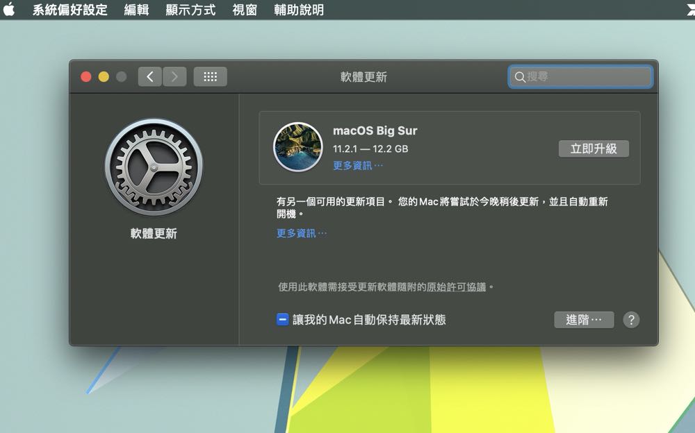 出現空間不足的提示,造成時間的浪費或是系統的故障,因此今天特地為 macOS Big Sur 11.2.1 再帶來些小更新,讓用戶在升級前先提醒需要的儲存空間。