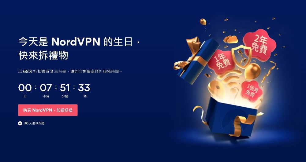 NordVPN 的 2 年方案原價為 286 美元(約 7,992 新臺幣),打 32 折後為 89 美元(約 2,487 新臺幣),等於每個月只需付新臺幣 103 元,就能獲得 NordVPN 服務。另外,還有機會額外獲得 1 個月、1 年、2 年不等的隨機優惠。