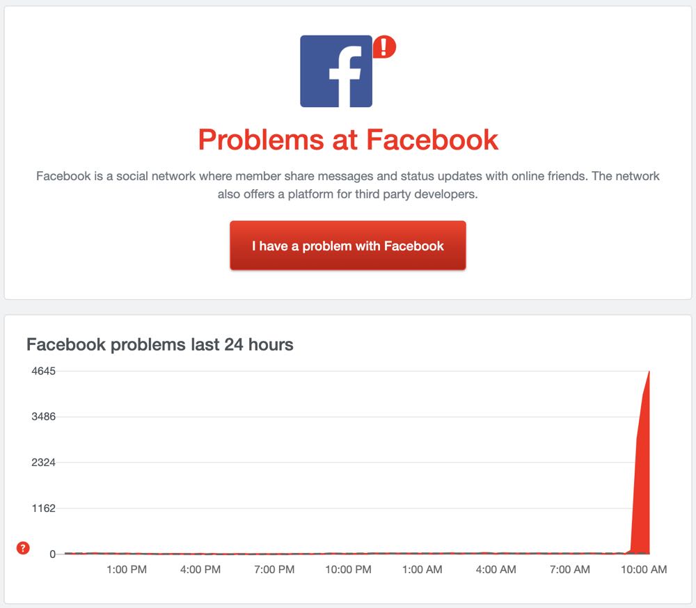 19 日早上 10:00 左右,桌機版 FB 開始出現無法開啟網頁的情況,根據網頁問題查詢網站 Downdetector 上資訊了解,FB 旗下包括 Facebook、Instagram 與 Facebook Messenger 三項服務通通都面臨無法開啟的問題!