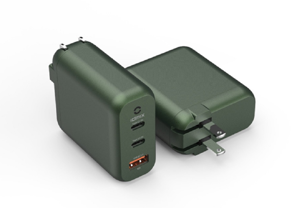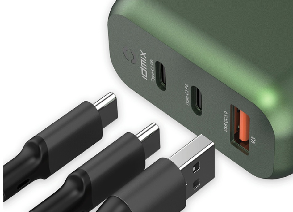 idmix 氮化鎵 PD 65W 智能充電器配備三個充電孔,除了兩個 Type-C 的充電孔外,還配備一個 USB QC3.0 快充充電孔,可同時為三個裝置充電。另外,它的插頭採用可摺疊設計,隨身攜帶會更加方便。