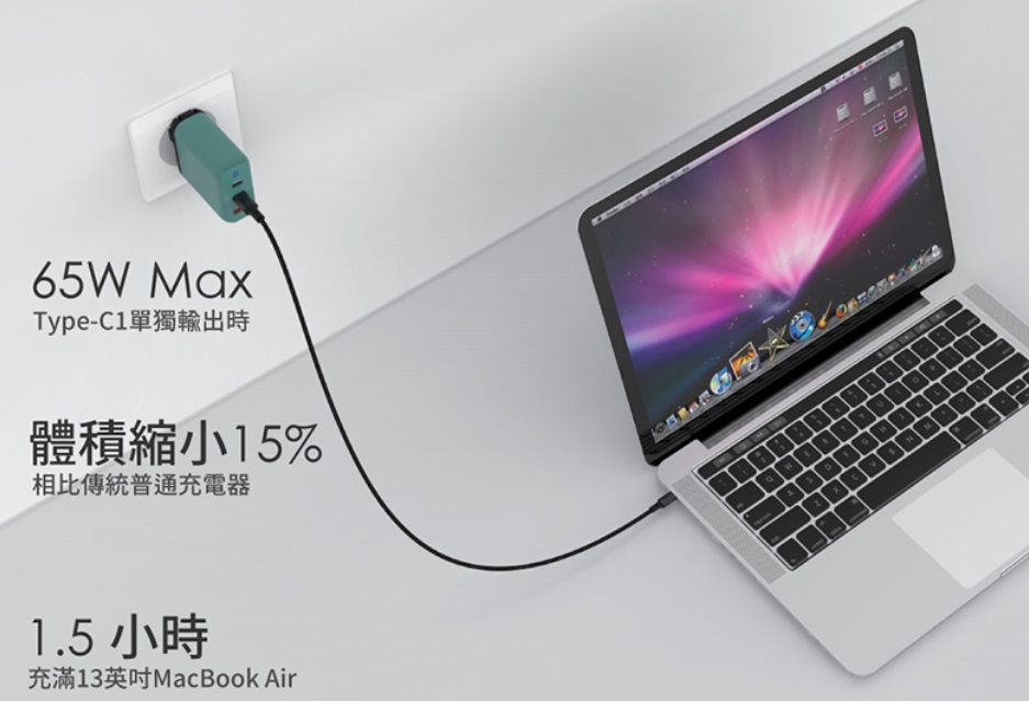 根據官方數據指出,當使用 Type-C1 單一輸出時,最高可達 65W,若以 13 吋的 MacBook Air 為例,大概只要 1.5 個小時就能充滿,比起原廠充電器快上不少,很適合經常在外辦公的朋友使用。另外,若同時使用 Type-C1 與 Type-C2 為兩個裝置充電,則可以提供 45W PD 快充與 18W PD 快充,同時為 MacBook 與 iPhone 充電絕對沒問題。
