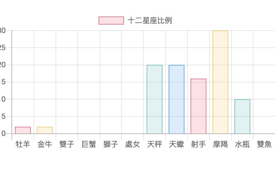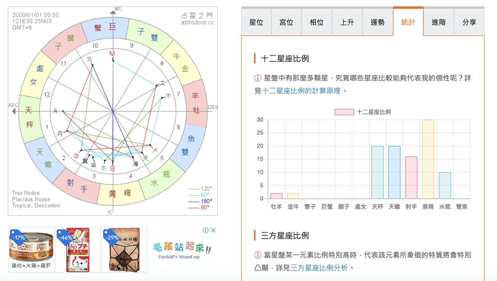 沒錯,當我們選擇「統計」後,就會看到想要的 12 星座比例圖了! 12 星座比例圖的概念就是來自於星座命盤中有那麼多顆星體,而每顆星體又都還會落入十二星座中的一個,而一個人的性格不太可能只有被一個星座所決定。就像大家常討論的太陽星座,其實也都只是性格中的一部分,星盤中還有月亮星座、上升星座等,甚至連命主星星座都存在一定的影響。