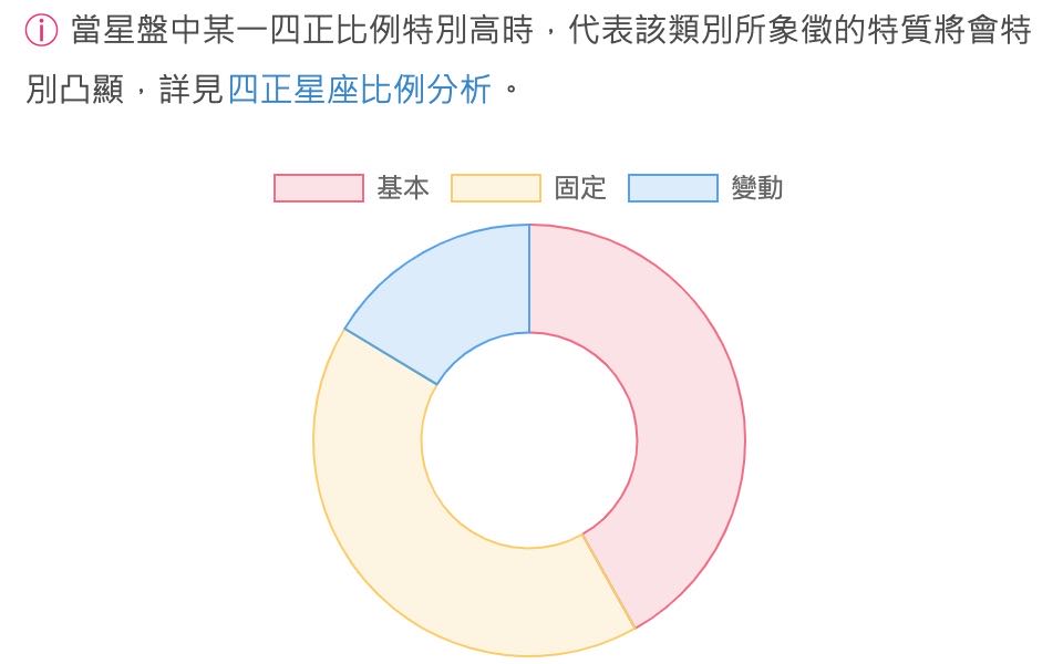 最後還有一個四正星座比例分析,四正(Quadruplicities)就是將十二星座按照基本、固定、變動分成三大組,每一組內的星座不是四分相,就是二分相。當星座命盤中的行星與尖軸落入某一組的比例特別的高時,則代表該類別所象徵的特質在生命中將會特別凸顯。占星老師安格斯也整理出四正星座比例的解釋,讓更想要認識自己的朋友能多點參考。