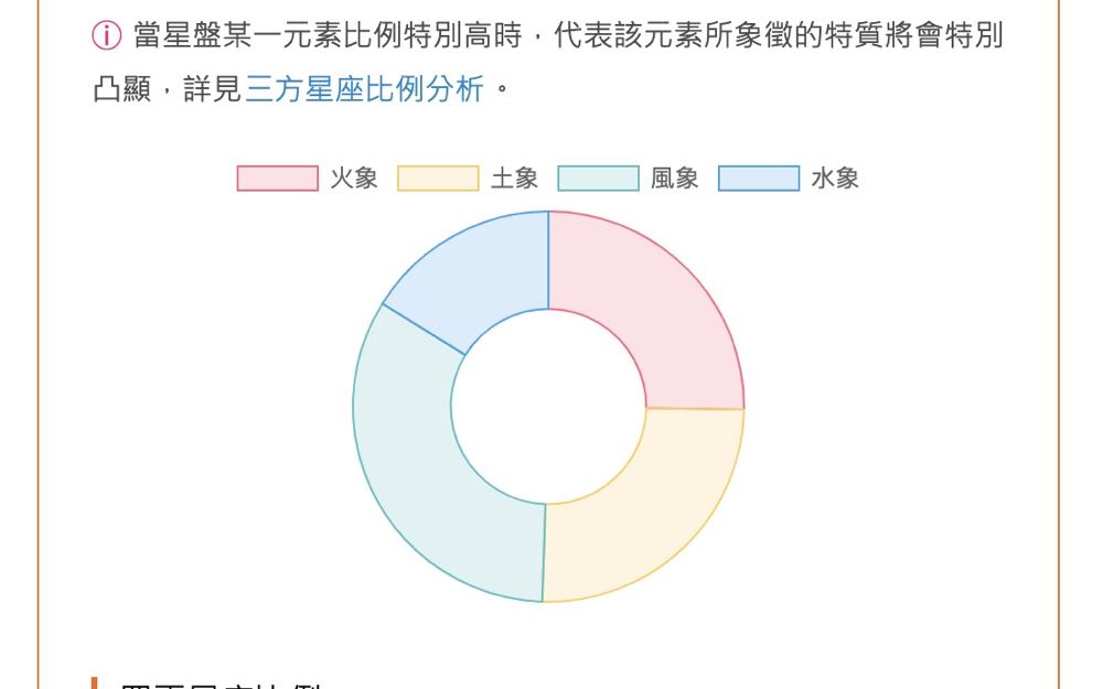 除了 十二星座統計外,下方還有一個 三方星座比例分析。三方(Triplicities)就是將 12 星座按照剛剛提到的四大元素(土、火、風、水)來分類,每一類會包含三個星座。當星座命盤中的行星與尖軸落入某一元素的比例特別的高時,則代表該元素所象徵的特質在生命中將會特別凸顯。