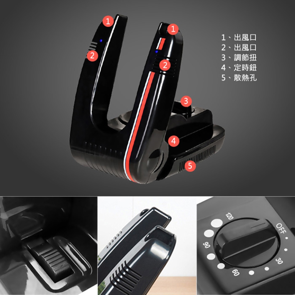 LTP 烘鞋機具備兩個可活動支架,支架上設有兩個出風口,並具備折疊功能,不用時可以將支架收折起來,有助於減少收納空間或是更容易隨身攜帶。另外,調節扭、定時扭以及散熱孔皆設置在底座上,使用時務必注意留意周遭的散熱空間是否足夠。