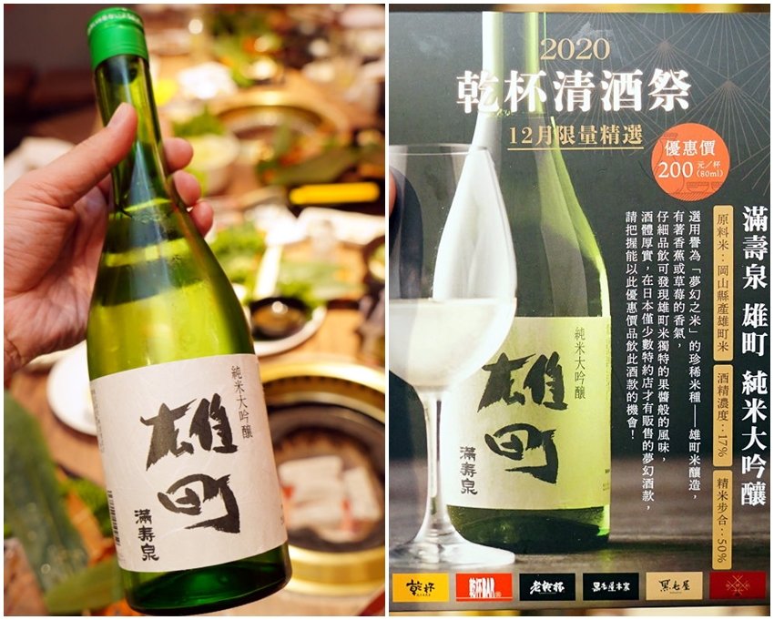 ▼12月也有推出乾杯清酒祭,這次主打的是滿壽泉的「雄町」,是採用被稱為夢幻之米的雄町米來釀製而成的純米大吟釀,現在一杯只要200元就能品嘗得到,真的很難得~~有興趣的朋友要喝要快啊!(未滿十八歲請勿飲酒)