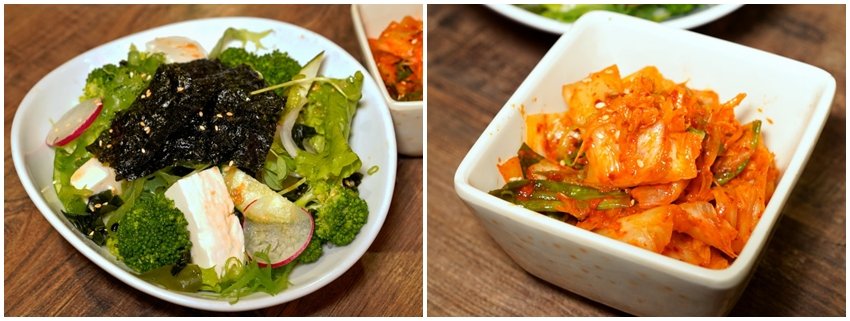 ▼乾杯自家製泡菜、燒肉店的沙拉,兩種都很適合當作開胃菜或是搭配燒肉享用,吃起來也更加清爽順口!