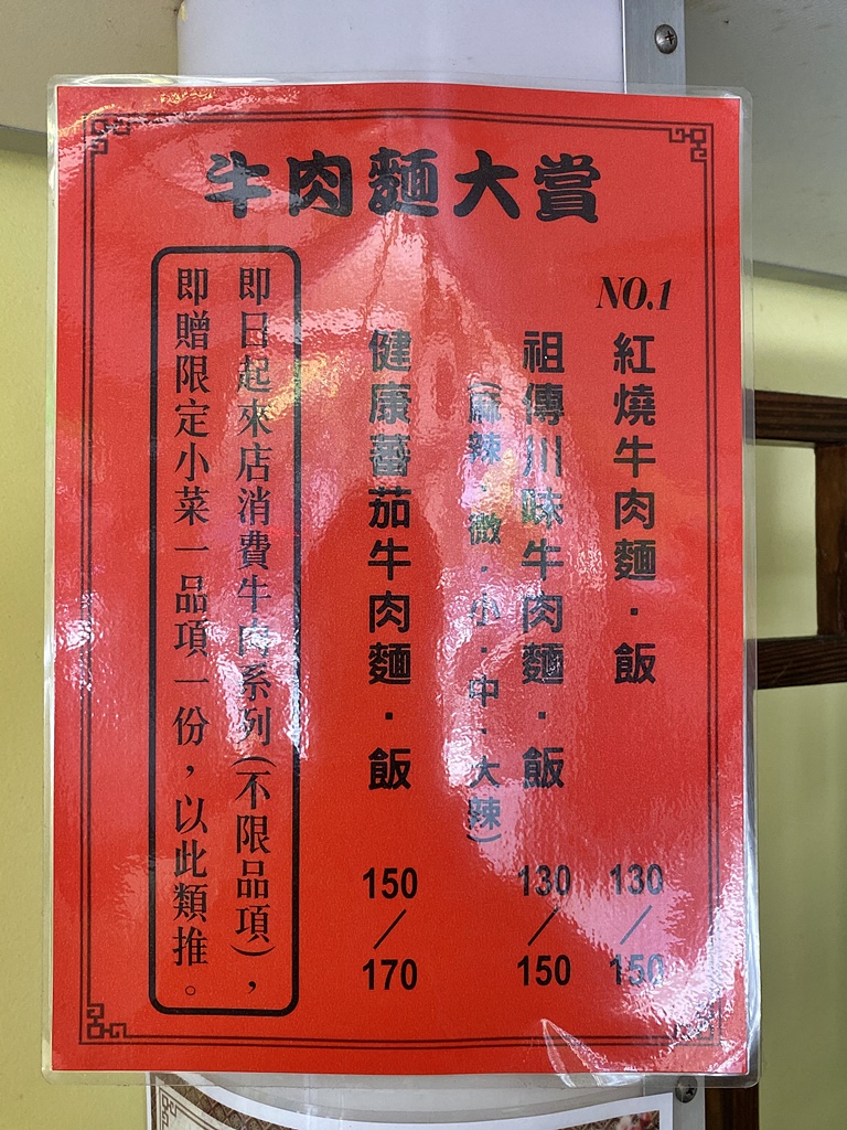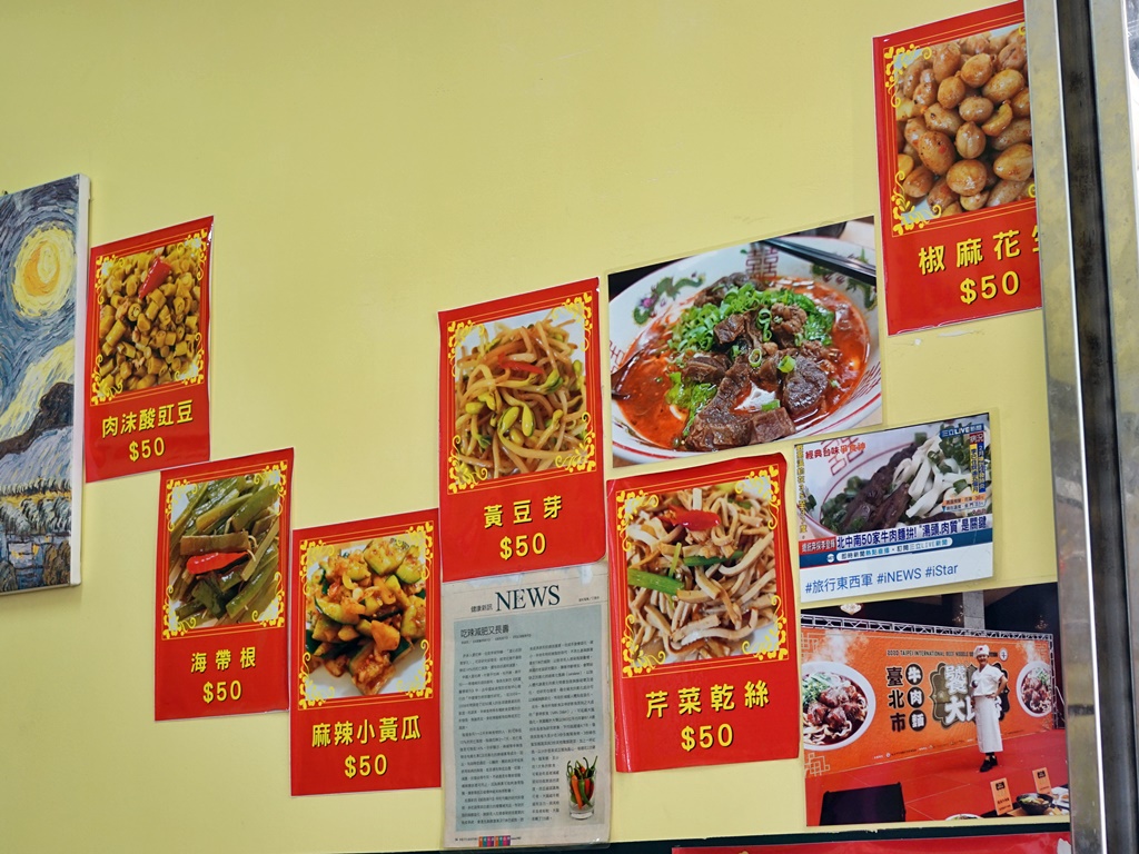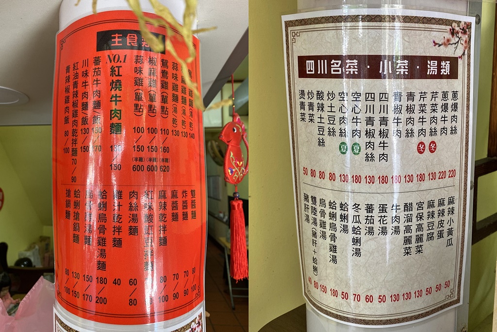 菜單通通貼在牆壁跟柱子上,拿不下來只能這樣拍了,點餐需要自己手寫單子,便條紙跟筆都放在櫃台上,如果遇到老闆娘在廚房煮麵,可以寫好單子拿進去給她,然後自己找位置坐,她只有一個人就別對她太苛求了~成都名小吃提供各式川味的麵類、名菜、小菜跟湯類,店家特別推薦牛肉麵系列,凡點牛肉系列不限品項即贈小菜一份!