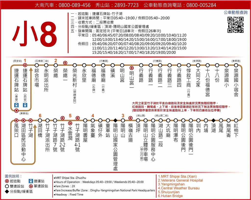 6.自捷運萬芳社區站搭乘休閒公車109路至陽明山第二停車場,再轉乘128、129、小8、小9、124、131。