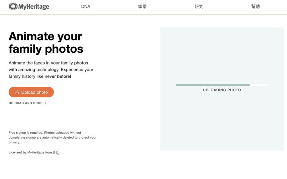 《MyHeritage》有兩種使用方式,一個是網頁版,另一個是 iOS 的 app,這邊我們就直接使用不需要下載 app 的網頁版來體驗。前往 《MyHeritage》的 Animate Photos,選擇「Upload Photo」後會先請我們利用 Facebook 或是 Google 帳號來登入,接著就能開始上傳想要的照片。