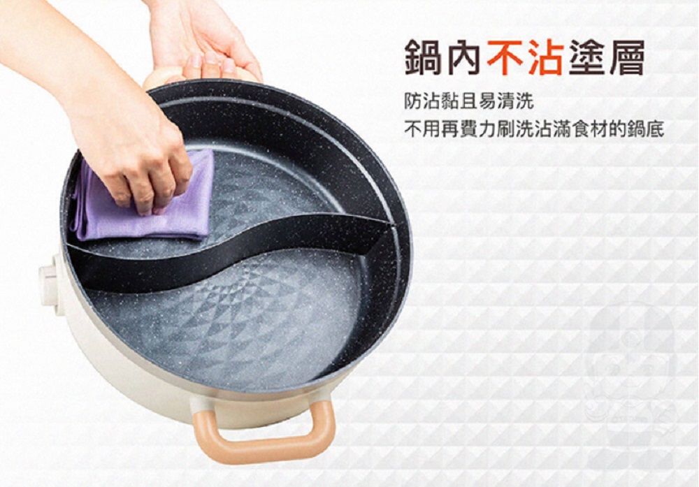 除了好用之外,也要好洗!鴛鴦鍋具內層選用不沾塗層,即使是比較難處裡的麻辣湯底,也能輕鬆清理,輕輕鬆鬆就能整理乾淨。另外,鍋底具有鑽紋鍋底設計,可增加受熱面積,讓導熱速度更快,等候時間縮短。