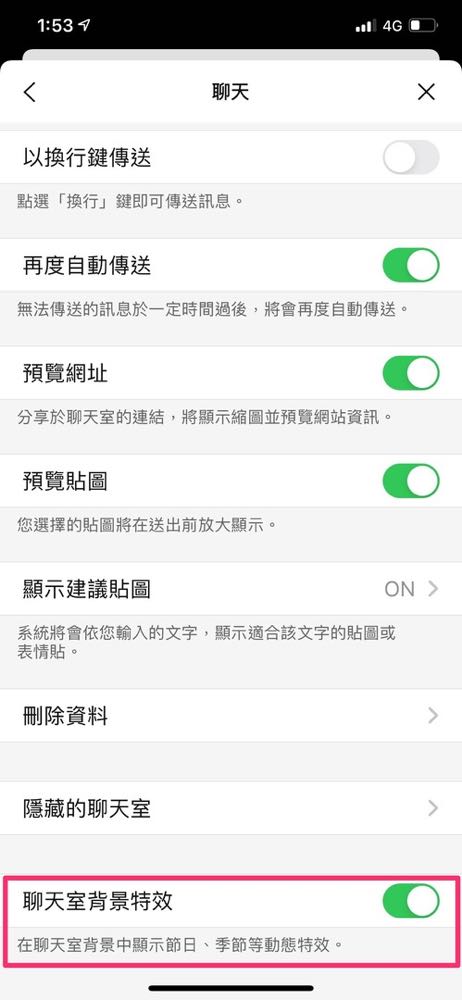如果版本符合,但特效都沒有出現,可以試試兩個方式,一個是關閉再重新開啟 LINE 應用程式,另一個方式就是在手機的 LINE 設定中,確認「聊天室背景特效」這個設定是否有打開,或是試著關閉、再打開。