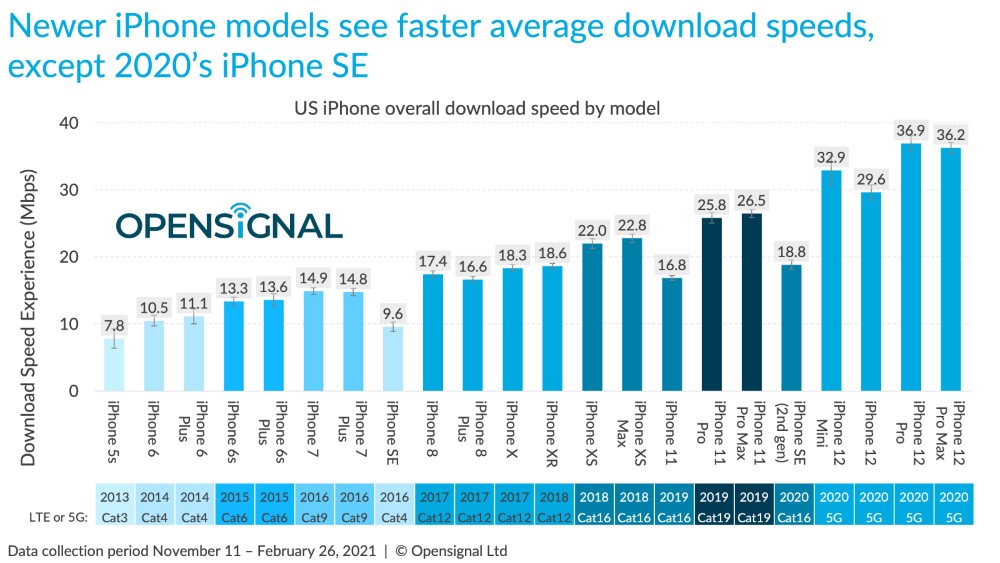 下圖是歷代 iPhone 位於美國的下載速度表現: