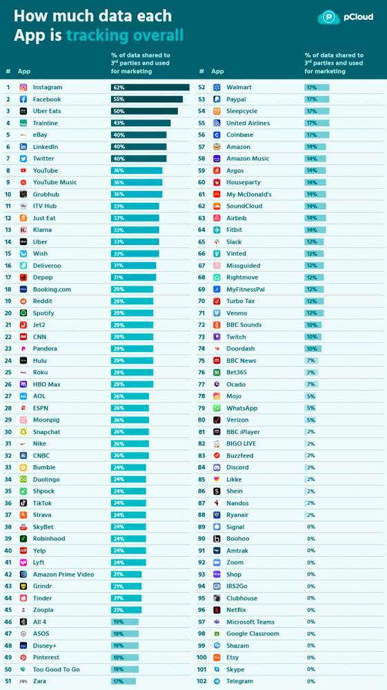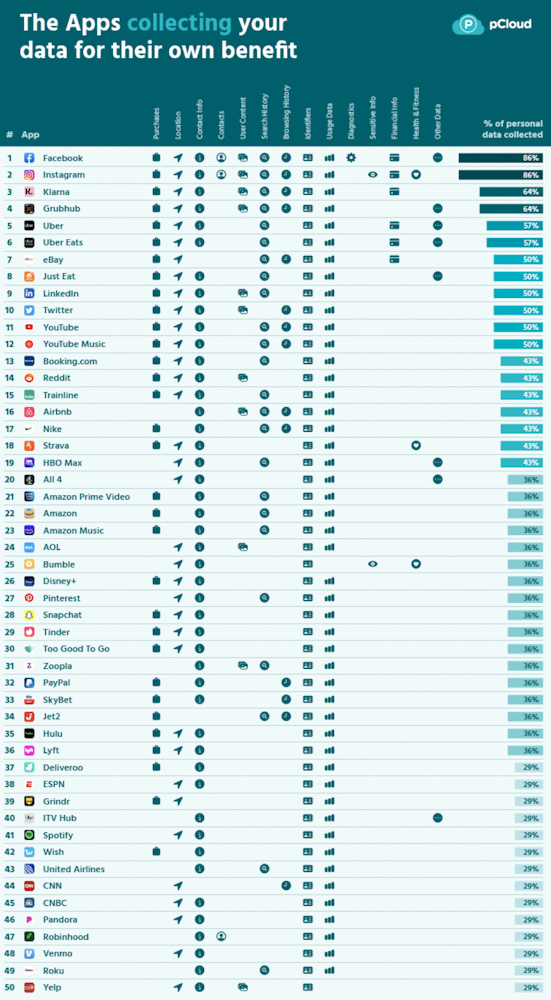 雲端技術公司 pCloud 彙整並分析了所有 iOS app 的隱私清單,發現一個驚人的事實:高達 8 成的應用程式,會將蒐集來的用戶資料用於第三方平台下廣告,好宣傳產品,或者向廣告商提供用戶資料以利宣傳,並從中收取利潤。