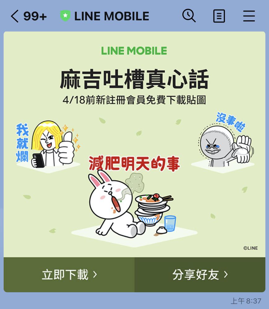 LINE 的可愛角色們總是相當受歡迎,尤其是以他們為主角的貼圖更是受到用戶們的熱愛使用。現在 LINE 就再以他們為主角,推出「LINE MOBILE 麻吉真心話」的限定免費貼圖,一組 16 張!