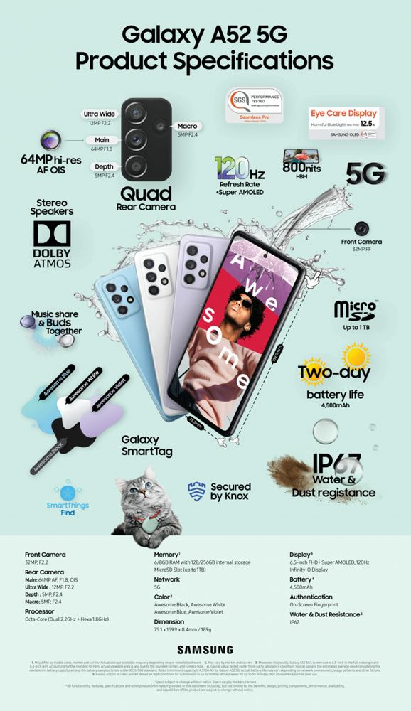 Galaxy A52 5G 的規格是 6.5 吋 FHD+ Super AMOLED 螢幕 120Hz 螢幕更新率(A51 5G 為 60Hz)、Qualcomm S750G 八核心處理器、背部有 6400 萬畫素 F1.8 OIS 主鏡頭 + 1200 萬畫素 F2.2 超廣角 + 500 萬畫素 F2.4 景深鏡頭 + 500 萬畫素 F2.4 微距鏡頭 四鏡頭組合 、3200 萬畫素 F2.2 自拍鏡頭。