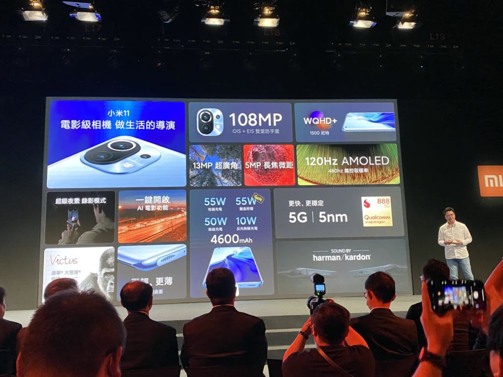 小米 11 使用了 6.81 吋 WQHD+ AMOLED 四曲面螢幕,解析度為 3200×1440,Qualcomm S888 處理器,台灣引進版本為 8GB+256GB。相機方面為 1 億畫素、f/1.85、OIS 光學防手震的廣角主鏡頭、1300 萬畫素、f/2.4、超廣角相機、500萬畫素 f/2.4 長焦微距鏡頭組合,拍照功能包括有魔法消除 2.0、夜景模式 2.0(廣角 / 超廣角)、超級夜景錄影、一鍵 AI 電影:魔術變焦、慢速快門、時間凍結、夜間縮時攝影、平行世界、靜止相框影片、電影影片濾鏡等,錄影則支援 8K 影片能夠錄影 24fps / 30fps。