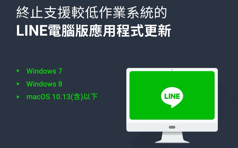 LINE 日前宣佈為了優化更新支援的配置,預計在 2021 年 5 月底左右,將針對 Windows 7、8,與 macOS 10.13 (含) 以下作業系統,終止支援 LINE 電腦版應用程式更新。也就是說,在終止支援 LINE 電腦版應用程式更新後,如果「不刪除」正在使用的 LINE 電腦版應用程式,仍可繼續使用,但後續將無法更新至電腦版 7.0.0 以上。