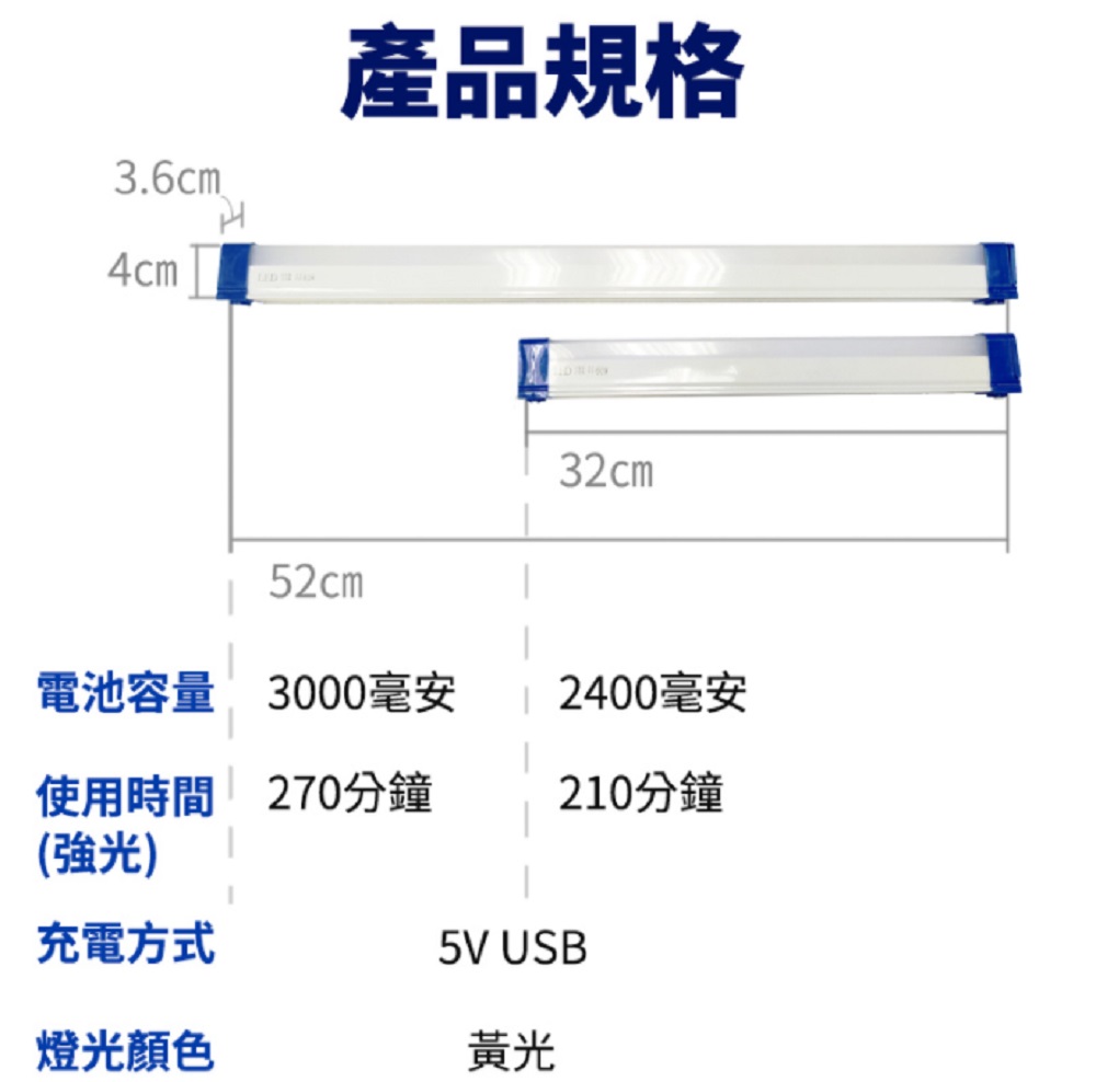 續航方面,32cm 版本內建 2,400mAh 電池,強光模式可連續使用 210 分鐘;52cm 版本內建 3,000mAh 電池,強光模式可連續使用 270 分鐘。充電方式都是使用 USB 充電 (5V),只要接上行動電源、5V 手機充電器、車充、筆電就能直接充電,即使在沒有提供電源的地方露營,也不用擔心續航力的問題。