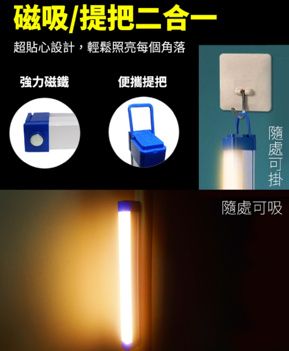 值得一提的是,它的燈管上方還具備強力磁鐵與便攜提把設計,不但可以吸附在任何鐵製品上,也可把它掛在掛勾、釘子上,輕鬆應付使用者的各種需求。