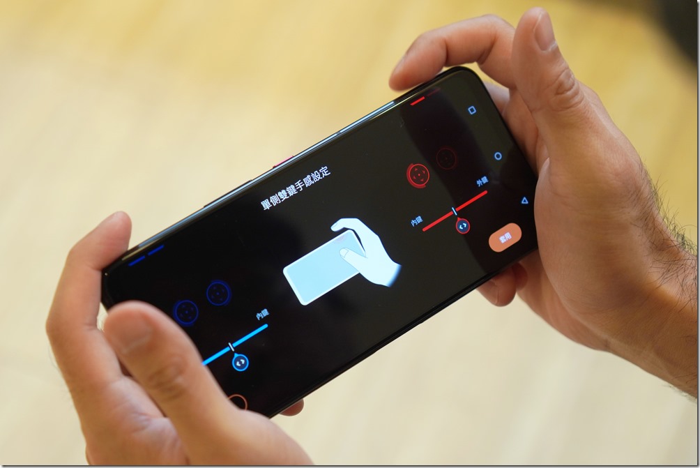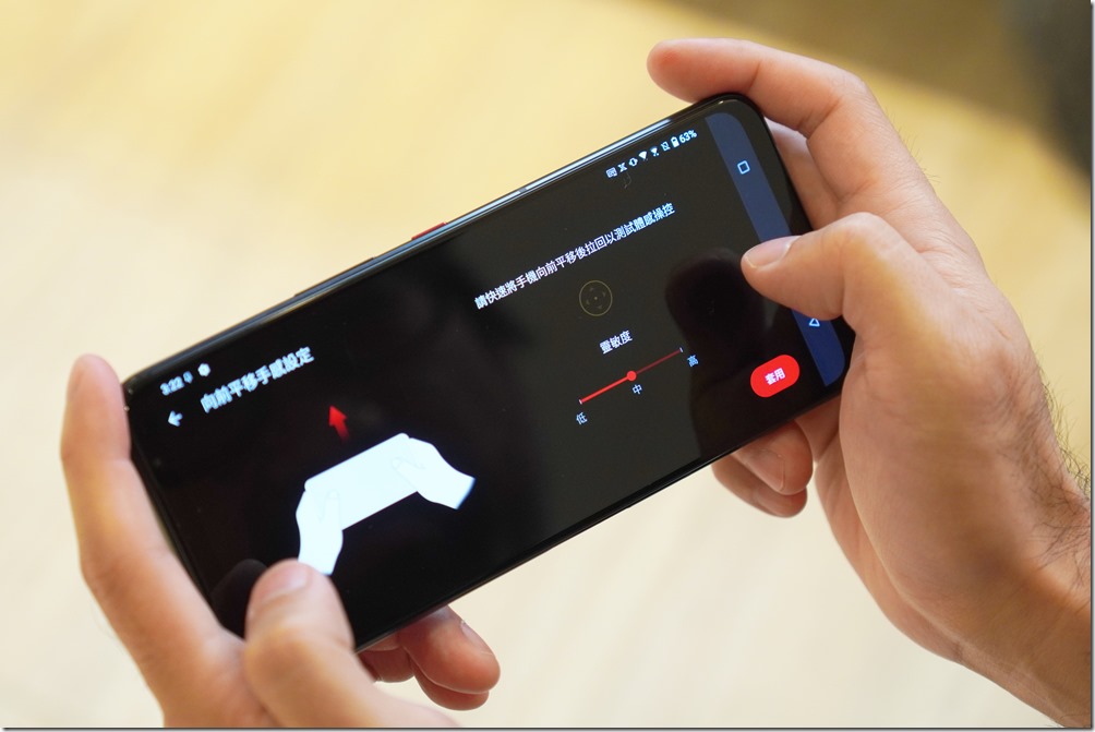 從設定中可設定超音波觸控鍵的操作方式,包含操作時的點擊力道、點擊位置調整,也可以用撥滑和長滑的方式操控超音波觸控區域,體感操作模式也非常細膩,提供前翻、後翻、左翻、右翻、左轉、右轉、上下晃、向前平移、向左平移、向右平移等多達十種的體感操作方式,設定完不同的巨集後在遊戲時啟用這樣遊戲進行時手指就不用那麼忙,可以快速完成想要的操控。