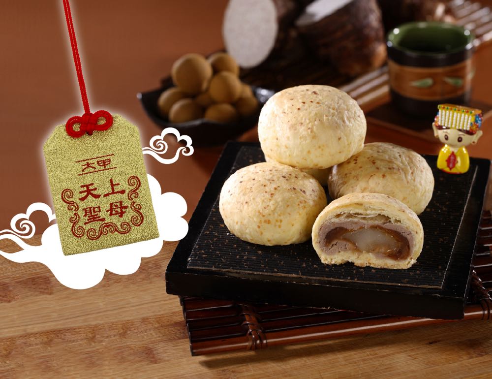 感念媽祖的牽成與指引,除了祭祀媽祖傳統知名糕點「奶油酥餅」外,裕珍馨更於媽祖節期間限定推出「媽祖餅禮盒」。以象徵豐衣足食的芋頭、代表福氣的桂圓與有如媽祖柔軟慈悲心的 Q 軟麻糬做為餡料,外層以添加了高纖胚芽的酥鬆餅皮,將三種福氣層層包裹起來,一口咬下嚐得到滿滿的美味。每一份手工製作的媽祖餅與奶油酥餅,都象徵是裕珍馨用心為每一位客人的祝福心意。