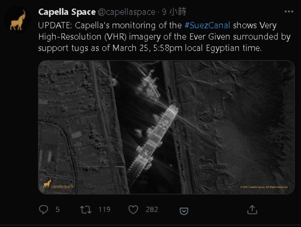 當然,長賜輪的擱淺事件全球都在關注,因此就有業者用自家的光學雷達衛星技術,使用上帝視角捕捉長賜輪的現場畫面。
