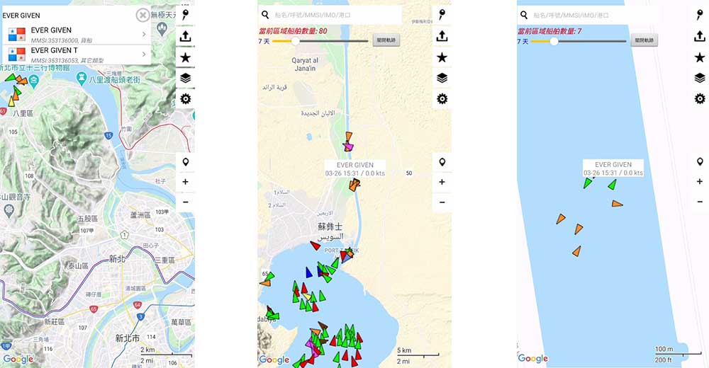 網頁版筆者用的是「Myshiptracking」,功能雖然跟 App 大同小異,但拜於大螢幕,當你放大畫面,這些船舶圖示會依照比例顯示,因此你可以很好的分辨出哪艘是 400 公尺長的長賜輪,哪艘是在旁負責拖拉船舶的拖船。