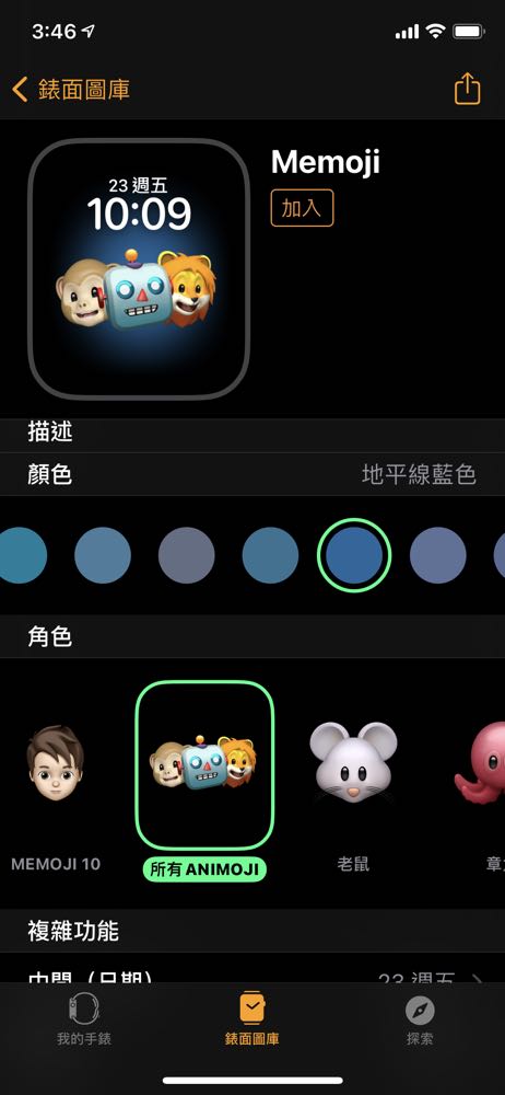 打開 app 選擇下方中間「錶面圖庫」→ 「Memoji」後不僅能夠選擇想要的圖案,甚至還能選擇背景色。
