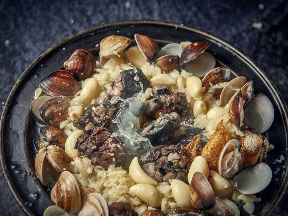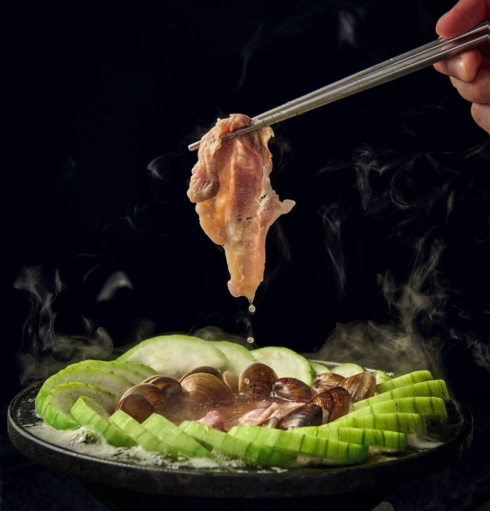 爆炒蒜頭蛤蠣烏骨雞鍋,以麻油、大量蒜頭與烏骨雞一同爆香,搭配新鮮蛤蠣與蔬果清湯,湯頭濃郁香醇,烹煮時間越長蒜頭湯頭越加鮮甜,是蒜香迷不容錯過的美味。