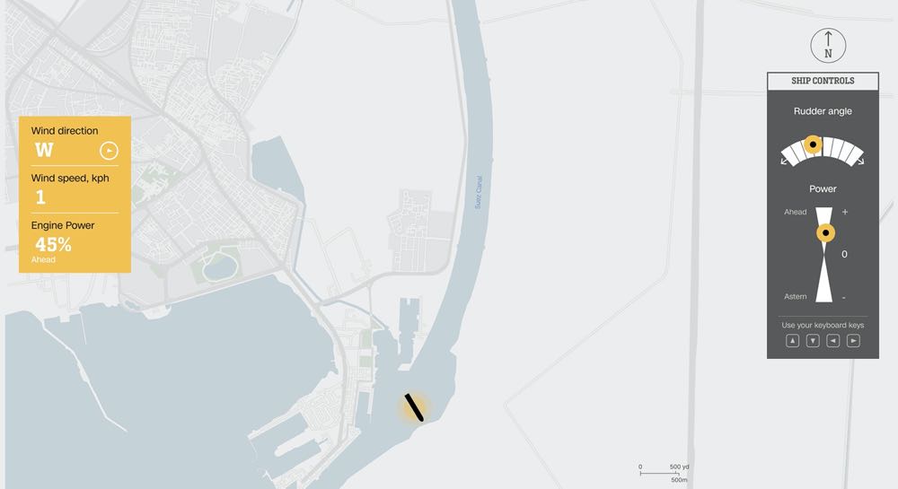 《穿越蘇伊士運河》 這個網頁模擬是由 CNN 與船員 Andy Winbow 及 Yash Gupta 船長所合作設計,模擬體驗中主要是以水深、風速、風向、動力等一些基本天候因素來當作參考值,我們透過鍵盤的上下左右來調整舵的方向與動力,目標就是讓自己駕駛的這艘船平安地穿過蘇伊士運河。