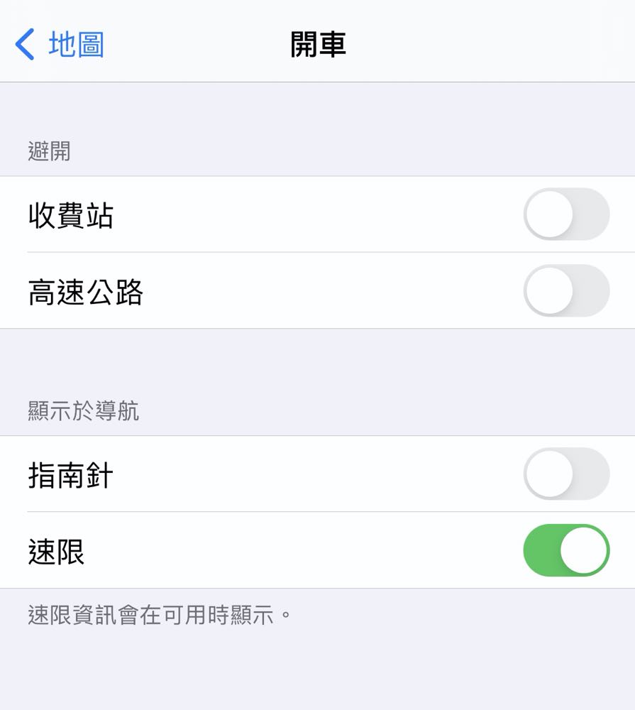 基本上用戶只要更新到 iOS 14.4.2 後啟用 Apple Maps 導航就會出現提示,但如果不放心或是更新後並沒有出現的朋友,也能透過「設定」>>>「地圖」>>> 「路線 – 開車」 中將「速限」 功能開啟。
