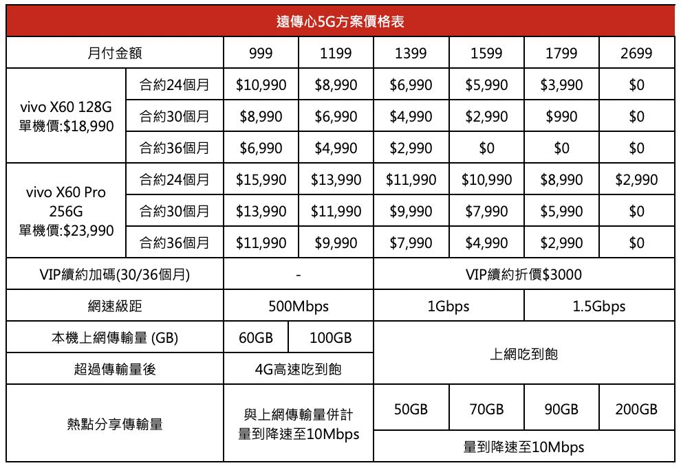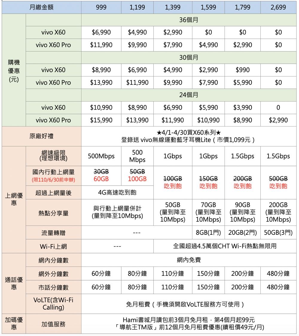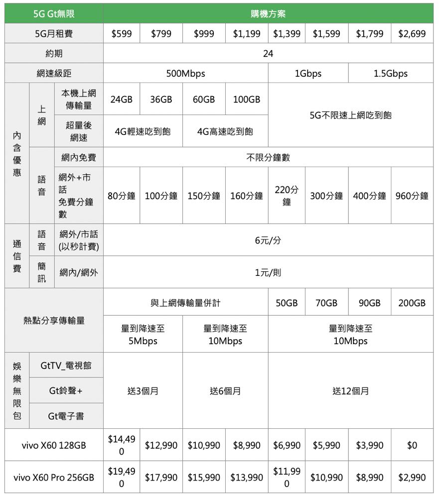 買 vivo X60 系列搭配「5G Gt 無限」1399 資費方案,X60 128GB 專案價 6,990 元、X60 Pro 256GB 專案價 11,990 元,可享 5G 不限速上網吃到飽外,再送 12 個月的【Gt TV_電視館】、【Gt鈴聲 + 】及【Gt 電子書】娛樂無限包,4/30 前申辦 4G/5G 700 元以上購機方案,有機會獲得 1 萬元 SOGO 禮券。