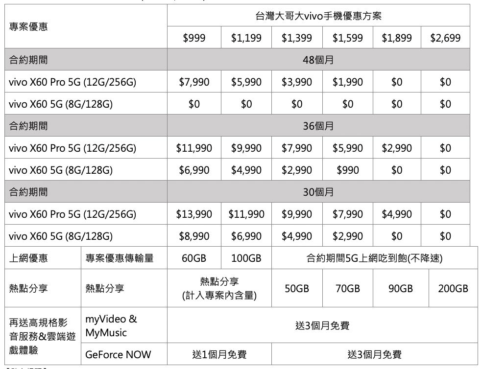 搭配台灣大 5G 999 元專案、綁約 48 個月,就能 0 元入手 vivo X60,除了享有每月傳輸量 60GB,還有影音和雲端遊戲服務優惠,包括 3 個月 myVideo 與 MyMusic 免費、1 個月 GeForce NOW 雲端遊戲平台免費,5 月底前購機還可參加「麗寶雙人假期」抽獎(市價14,220元),每支手機限一次抽獎機會,每月抽出 4 名幸運兒。