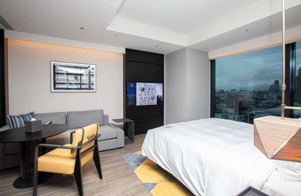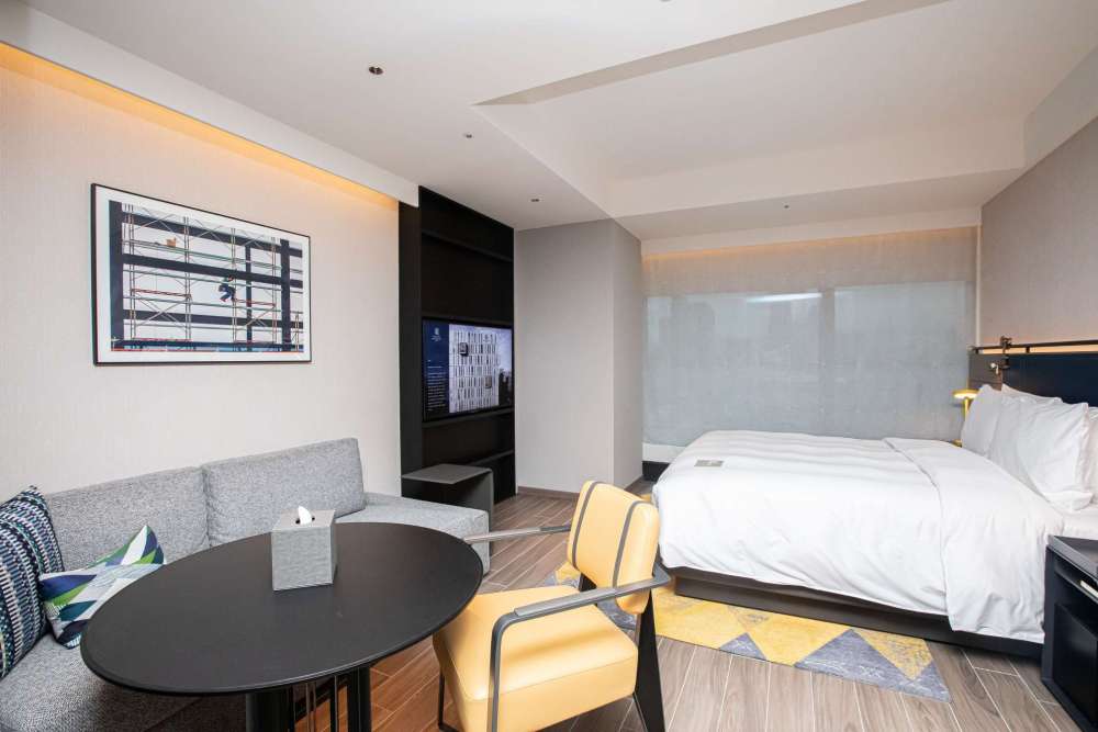 換個角度來感受一下豪華客房的起居空間吧!大家會發現床邊有一個大型的玻璃落地窗
