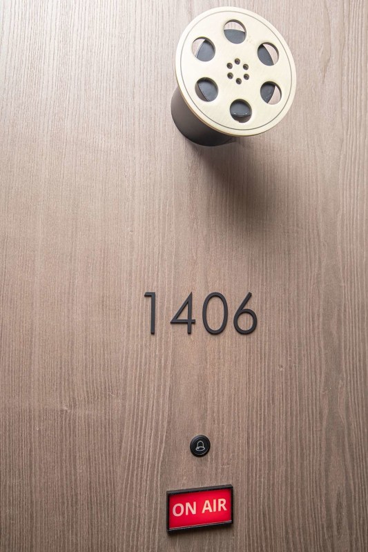 因為是以呼應200年前樟樹林邏輯而衍生出的賽璐珞發想與膠卷概念,所以房門上的裝飾與請勿打擾字樣,則是同樣概念配製成膠卷架跟ON AIR字樣