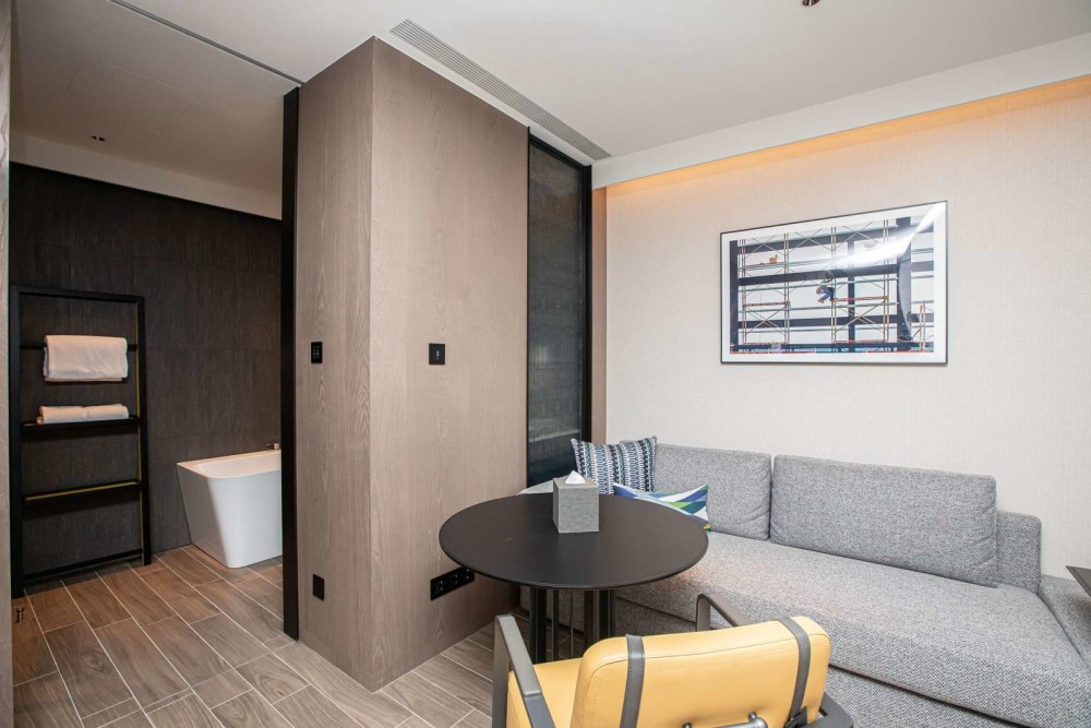 再來,這就是豪華客房最棒的起居空間,有個雙人座沙發區與一張圓桌,讓整體飯店空間變得更有彈性