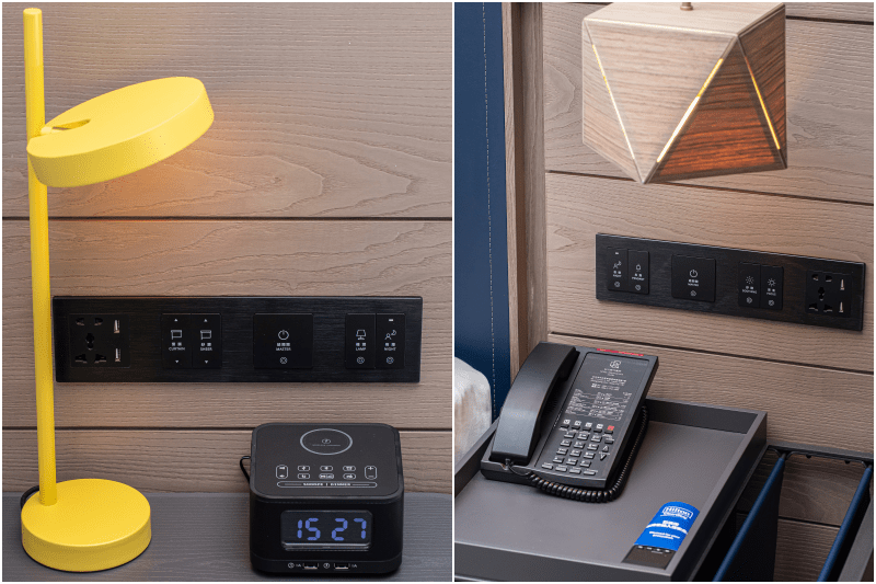 床頭的配置與插座及USB,搭配可愛的燈座又是沒話說的夠質感,第一次的台北時代寓所體驗讓人相當滿意