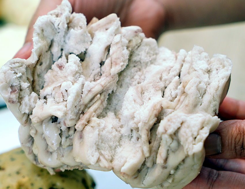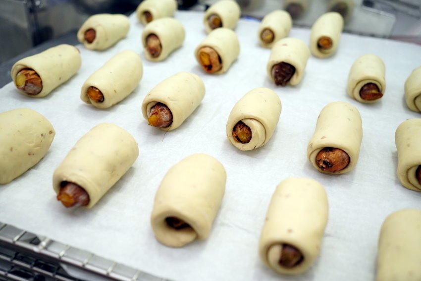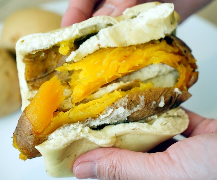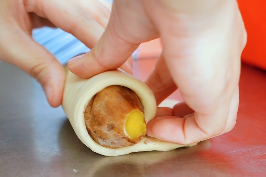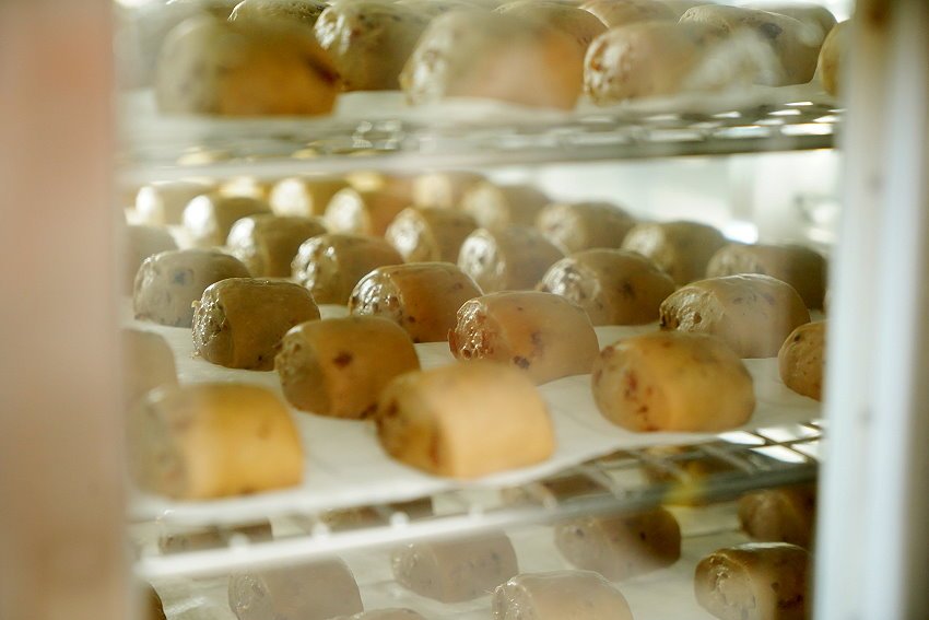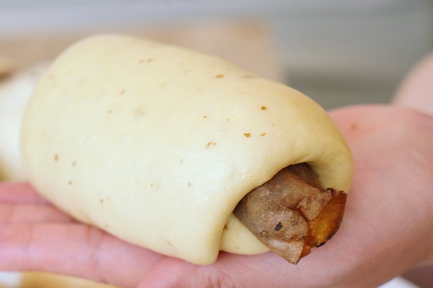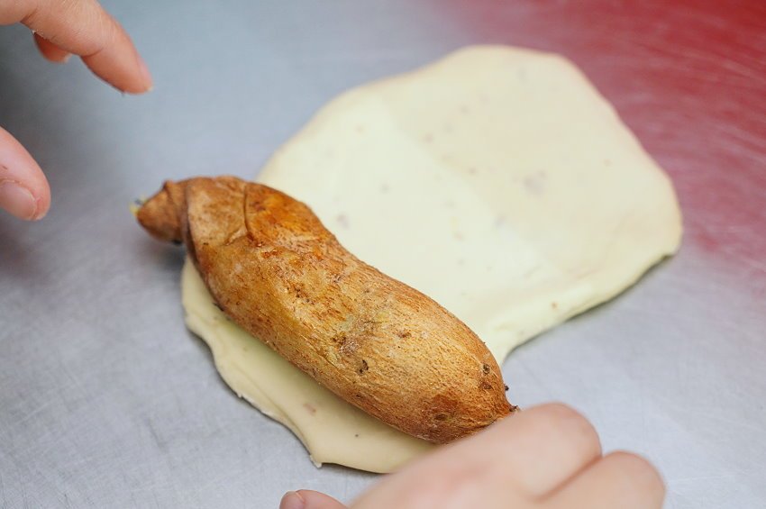 ▼製作過程也非常療癒,直接將烤好的一整條57號地瓜包進麵皮裡頭,很適合早餐或午茶來一份!