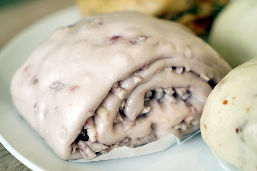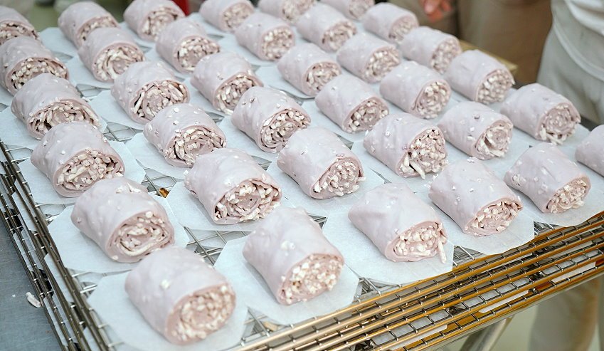 ▼芋頭捲也沒在開玩笑的,麵皮採用紫地瓜下去調色,內餡更是加入滿滿的大甲芋頭絲,光看就讓人口水直流啊!