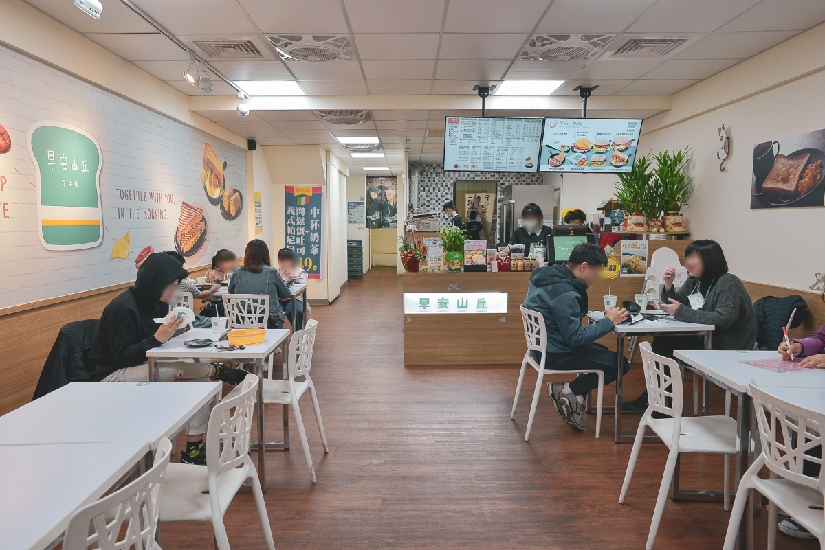 早安山丘早午餐新竹北大店位於新竹市北大路,附近有西門國小,周邊有些路邊停車格,門口可停放機車。週末用餐人潮滿滿,大家都帶著家人、孩子一起來用餐。空間明亮乾淨,簡單的早餐店擺設,質感藍綠色的招牌燈箱,為整個空間增添質感。因為用餐客群有很多家庭客,店內有提供兒童座椅,還蠻貼心,有需要的客人可以向店員說一聲,自行取用。