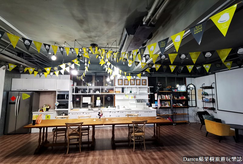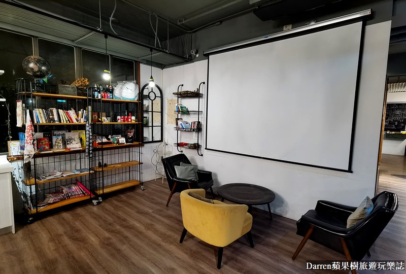 台南承億輕旅一樓公共空間,也有開放式廚房以及餐桌,裡頭有廚房家電都可以使用,另一側還有投影機,整個充分利用公共空間