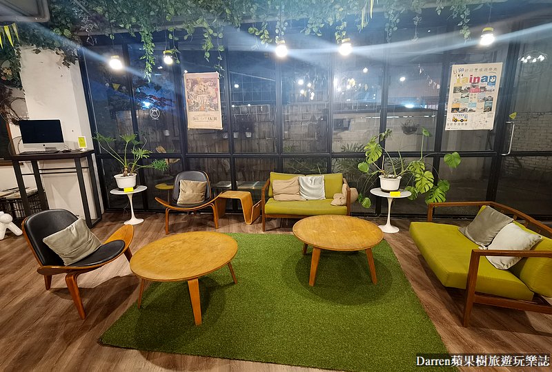 台南承億輕旅一樓交誼廳,公共空間寬敞舒適,木質家具以及跳色椅子加上綠色植栽,讓人有種溫暖放鬆的感覺,在這裡有機會可以認識來自各地的朋友
