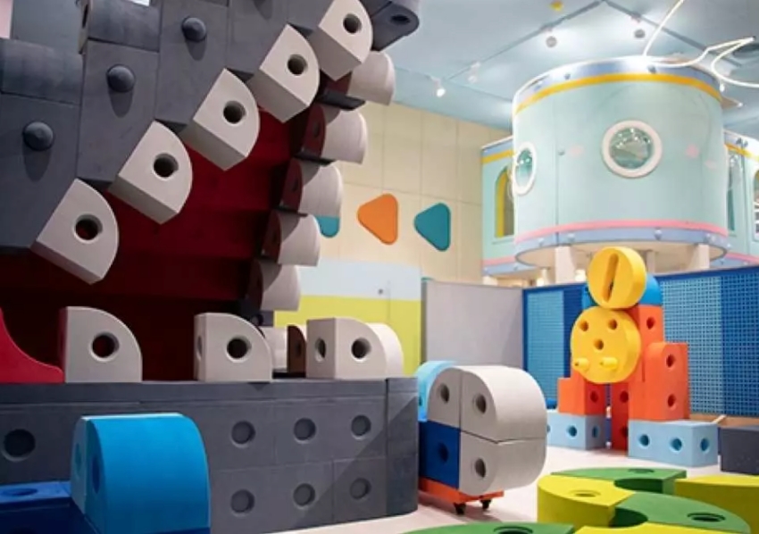 桃樂比互動遊戲區裡面有馬賽克畫布、齒輪畫布、趣味桌遊、神奇攀岩等設施可以讓小朋友們隨意組裝發揮創意,而其中還有一整區的積木平原,各種超巨大的積木,小朋友走進來根本像是巨人國,這絕對是在家裡沒辦法玩到的玩具,也是巧虎夢想樂園裡拍照效果最棒的地方。