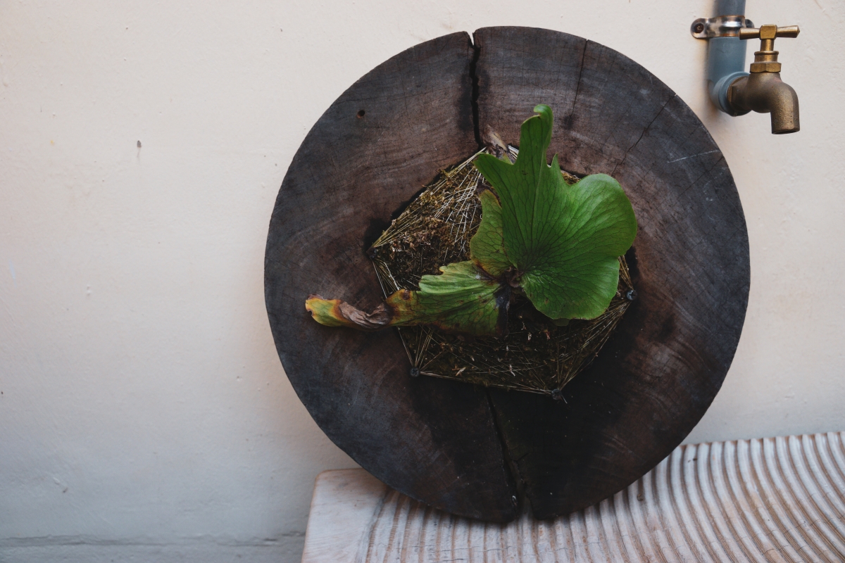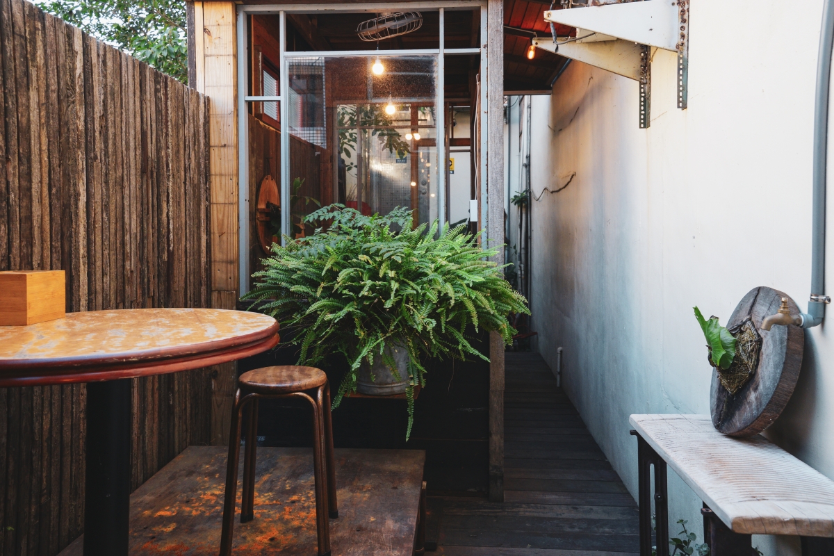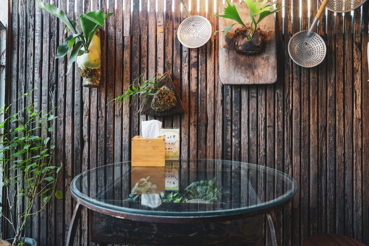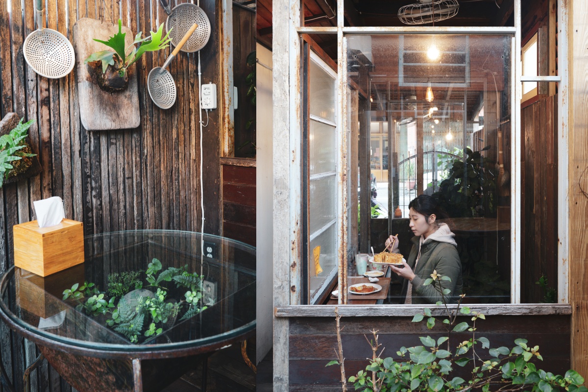 從小窗戶上拿著菜單走進旁邊的空間,會覺得來到另一個世界,與以前內用的空間完全不一樣,店家在 Instagram 上有介紹,這是與藝術家「王飛明」合作打造的空間,內用分別為前、中、露天、後,總共四桌。選定桌位後,填寫菜單至小窗戶點餐結帳,店員會將餐點送上桌,用餐結束請客人自助式回收,木餐盤歸還到點餐的櫃檯即可。