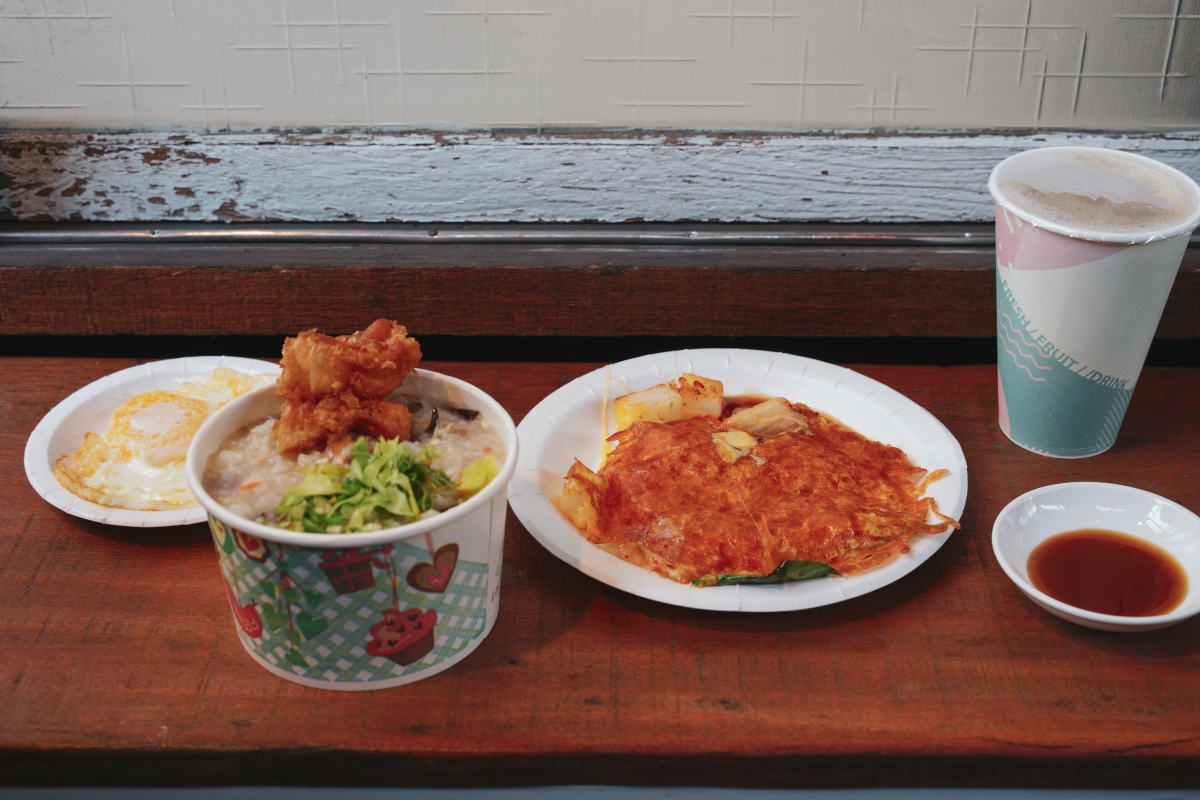 提供傳統蛋餅與鹹粥,蛋餅口味蠻多的也有些特別口味,像是皮蛋、臭豆腐,可以選擇要辣或是正常(旁邊會放甜辣醬讓客人自行沾取)。鹹粥除了原本的阿嬤鹹粥,也新增了皮蛋鹹粥,可以加價加配料,像是荷包蛋、肉鬆、豆腐乳都是我們一般吃粥會加的配料,十分家常的料理搭配,讓人就像在吃阿嬤的鹹粥一樣溫暖。飲料以豆漿、紅茶來做基底微調變化,另外還有薏仁系列飲品選擇。