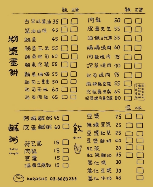 Kurashi 是日文 「暮らし」日常生活、過日子的意思,來到這裡就如同每一天一樣的平凡、自然。店門外看似老宅咖啡館,但這裡提供的是傳統蛋餅、鹹粥,價格平實、簡單美味的早餐,比起偶爾去一次的咖啡館,這樣讓人想天天去的早餐店,更令人期待。我之前在文章裡是這麼寫著,而這三年來,我用餐的次數的確比去咖啡館還多,相信許多人都知道,可愛的闆娘也知道我不定時就會過去用餐(鐵粉認證)。