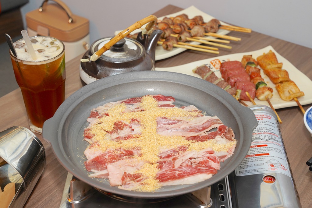 老公愛吃肉,就點了這個滿滿都是肉的壽喜燒,上面還用蒜酥擺了一個『牛』字,也太可愛了吧!開火前店員會協助淋上醬汁,煮至肉片呈粉嫩色澤就可以吃了!加了壽喜燒醬汁跟蒜酥,所以這道口味也是偏重一點~