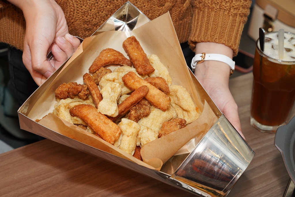 炸物這樣裝未免太逗趣!拼盤裡面有好幾種品項,其中一定有鹽酥雞,外酥內嫩好吃,其他還有百頁豆腐、花枝丸、甜不辣,油瀝的特別乾,吃起來不會很油膩,相對冷掉口感會比較乾,建議趁熱吃~