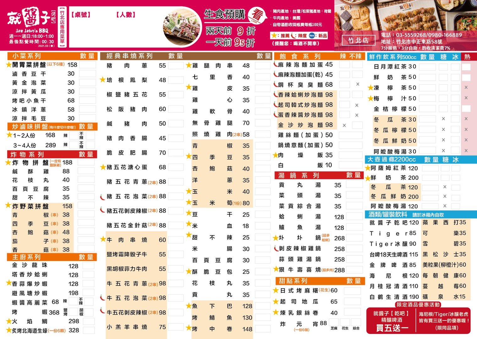 就醬子烤吧創始於2007年,致力發展為最『台』的台灣正宗烤串,在台中地區非常有名氣,也是不少台中人最愛的烤串店,據說他們的炒泡麵很厲害,終於等到他們來新竹開店了,以後又多一間吃宵夜的好去處,就醬子烤吧竹北店位於中正東路上,鄰近竹北 IKEA,附近有一個停車場,但不確定用餐尖峰時刻好不好停車,建議大家騎車前來較方便!